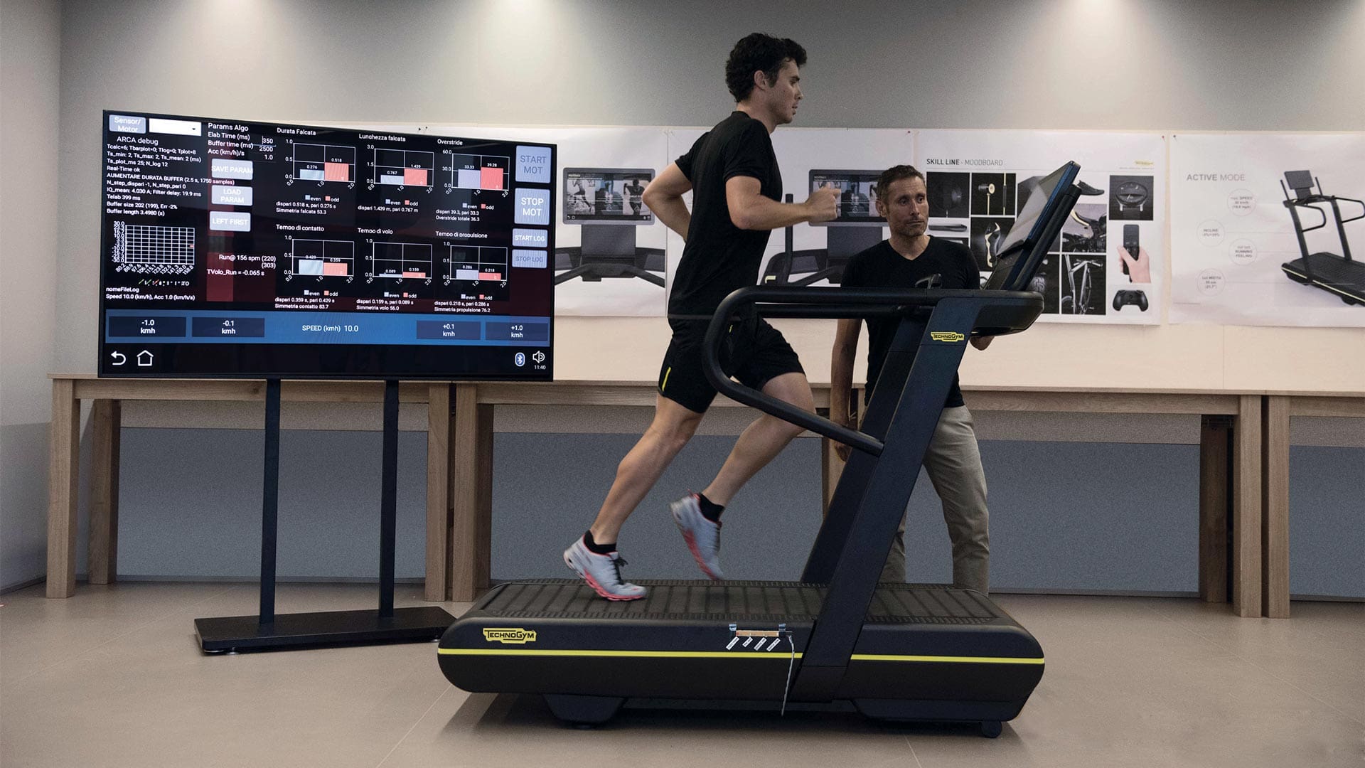Skillrun er udviklet sammen med forskningsinstitutter og velkendte universiteter og er designet til at gøre det muligt for atleter at opnå toppræstationer. Med erfaring som officiel leverandør af fitnessudstyr til otte udgaver af de olympiske og paralympiske lege, leverer vi den seneste udvikling inden for biomekanik og træningsmetoder til præcisionssportstræning. Nedenfor: Triatlonmester Gomez Noya tester færdighedsløbet på Technogym Lab ’83