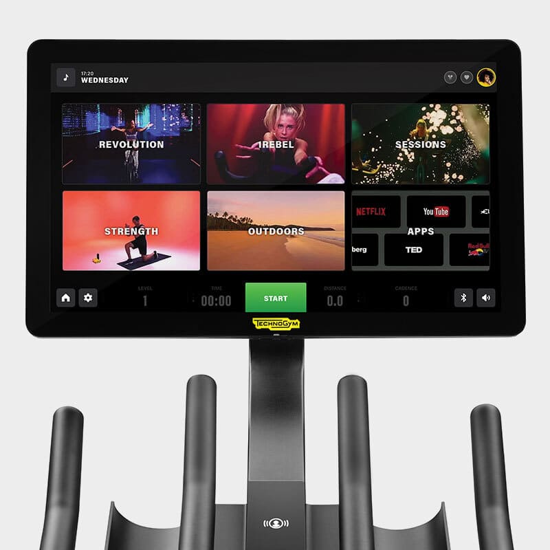 Technogym-cyklen er alsidig: Hjemmetræneren er udstyret med et display, hvor du kan foretage adskillige indstillinger og derefter dykke ind i nye verdener. Afhængigt af dine præferencer, aktiver en af utallige ruter, der vil tage dig til de smukkeste steder i verden: Bestig krævende pasveje i spektakulære bjergverdener, kryds den australske outback eller Andalusiens vidder. Hvis du tilslutter en Chromecast-adapter eller en Firestick til hjemmetræneren med TV, åbner der sig utallige andet indhold: stream shows, serier, film, musikvideoer og lad dine yndlingssange bringe dig frem under træningen. Tip: For at bruge det eksterne indhold skal du bruge de relevante apps på slutenheden, som du forbinder til cyklen.