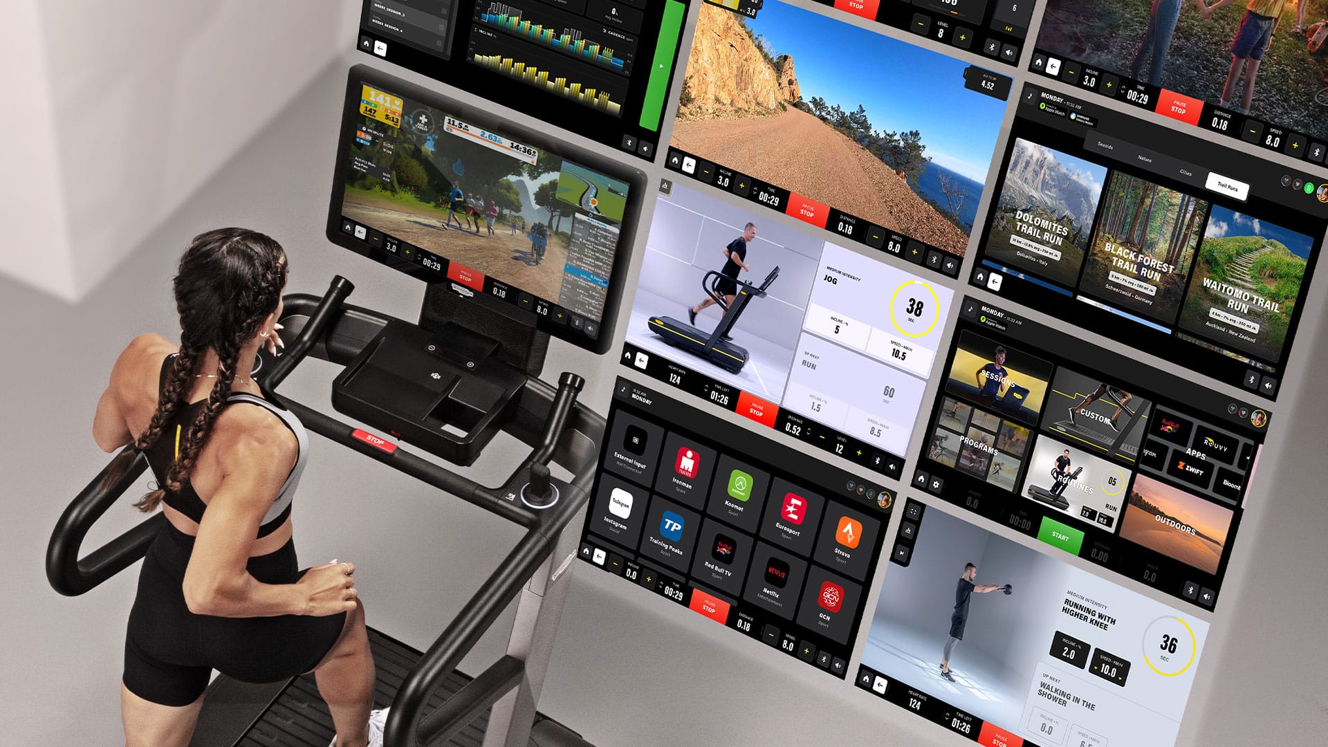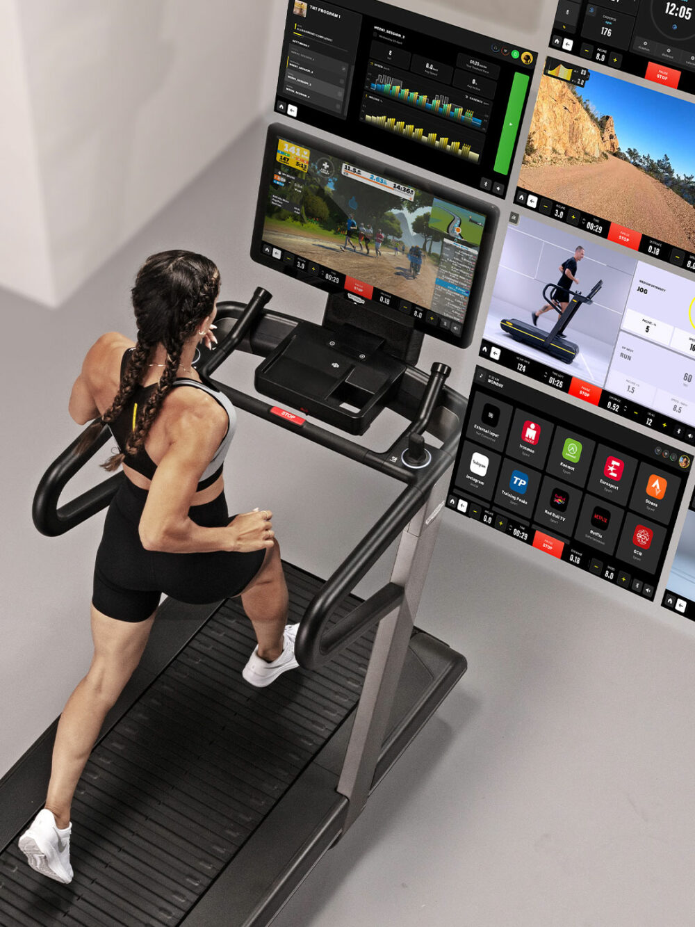 Dette omfatter en interaktiv skærm, der viser realistiske løbeture i forskellige landskaber og miljøer, og som kan tilpasses til din specifikke træning.