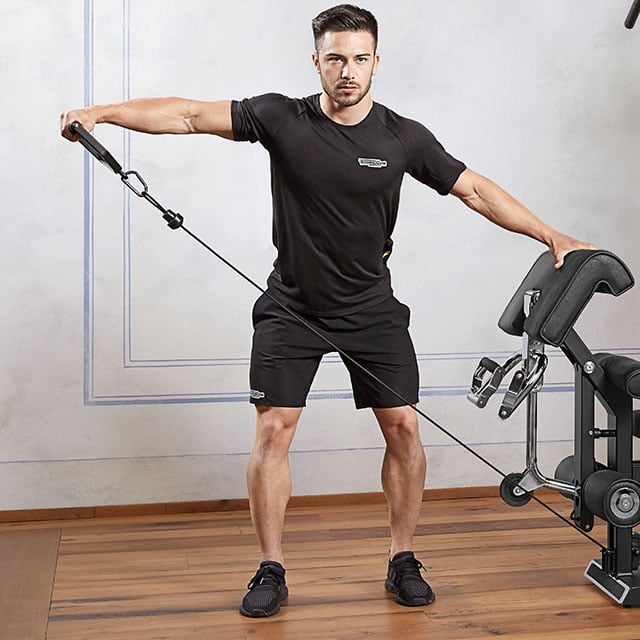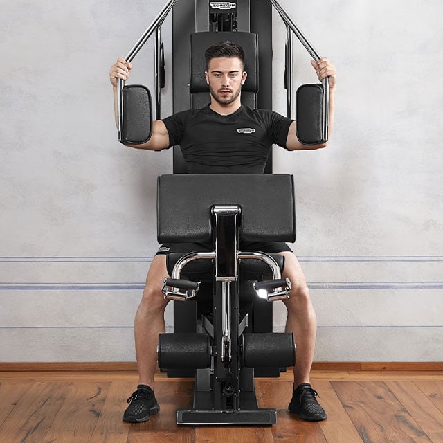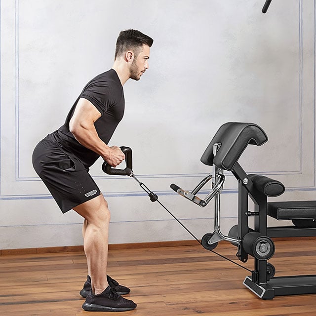Multifunktionsmaskinens unikke håndtag og knastsystem giver dig mulighed for at udføre mere end 25 forskellige øvelser uden at skulle skifte nogle elementer ud. Du skal blot vælge belastningsniveauet.